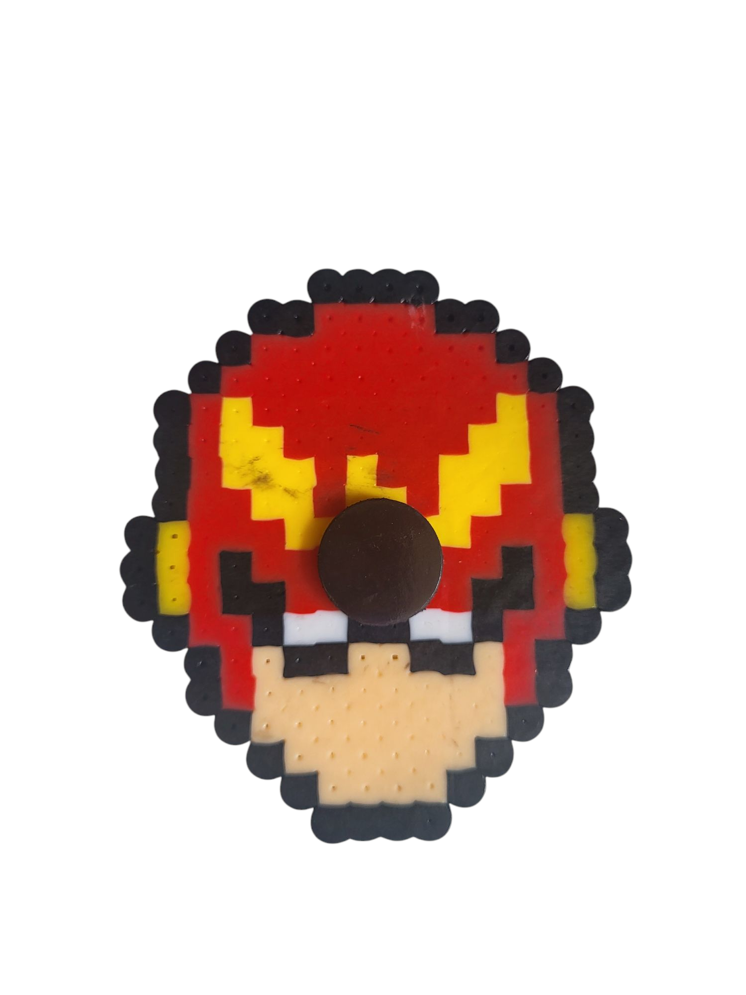 Show me your moves! This handcrafted Perler bead magnet features Captain Falcon, the legendary bounty hunter from F-Zero and Super Smash Bros. Melee. With his unmistakable red helmet and golden falcon crest, this piece packs a punch of retro charm.