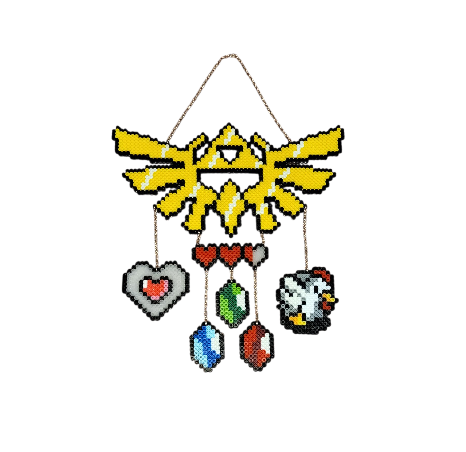 Channel the power of wisdom, courage, and strength with this Legend of Zelda-inspired dreamcatcher! The top features the iconic Triforce, crafted from 5mm Perler beads, while the hanging strands showcase classic in-game treasures — colorful rupees, shimmering hearts, and even a cheeky cucco. Whether you’re a lifelong Hyrule adventurer or just love unique wall art, this piece is a quest-worthy addition to your space.