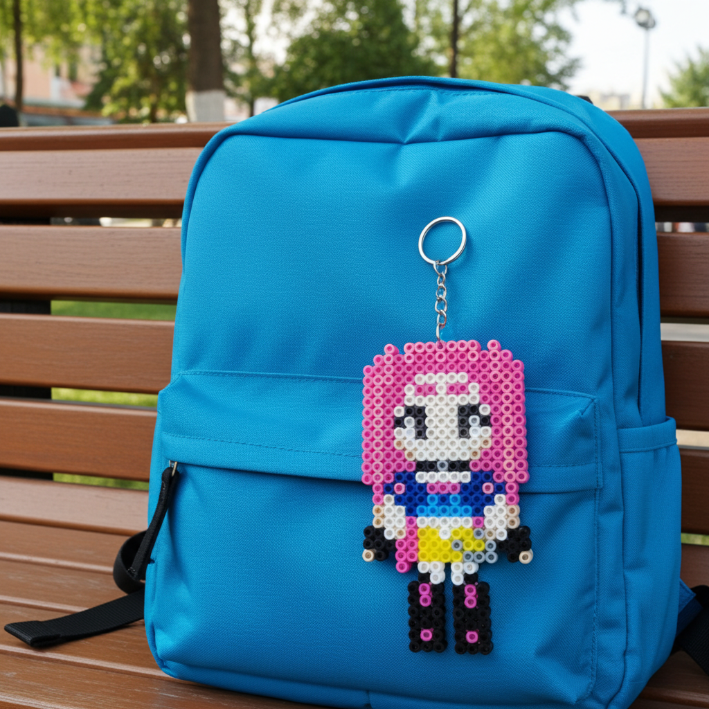 Tiny & detailed 5mm perler bead Mira keychain. Handcrafted with personality, perfect for keys or bags.Β
