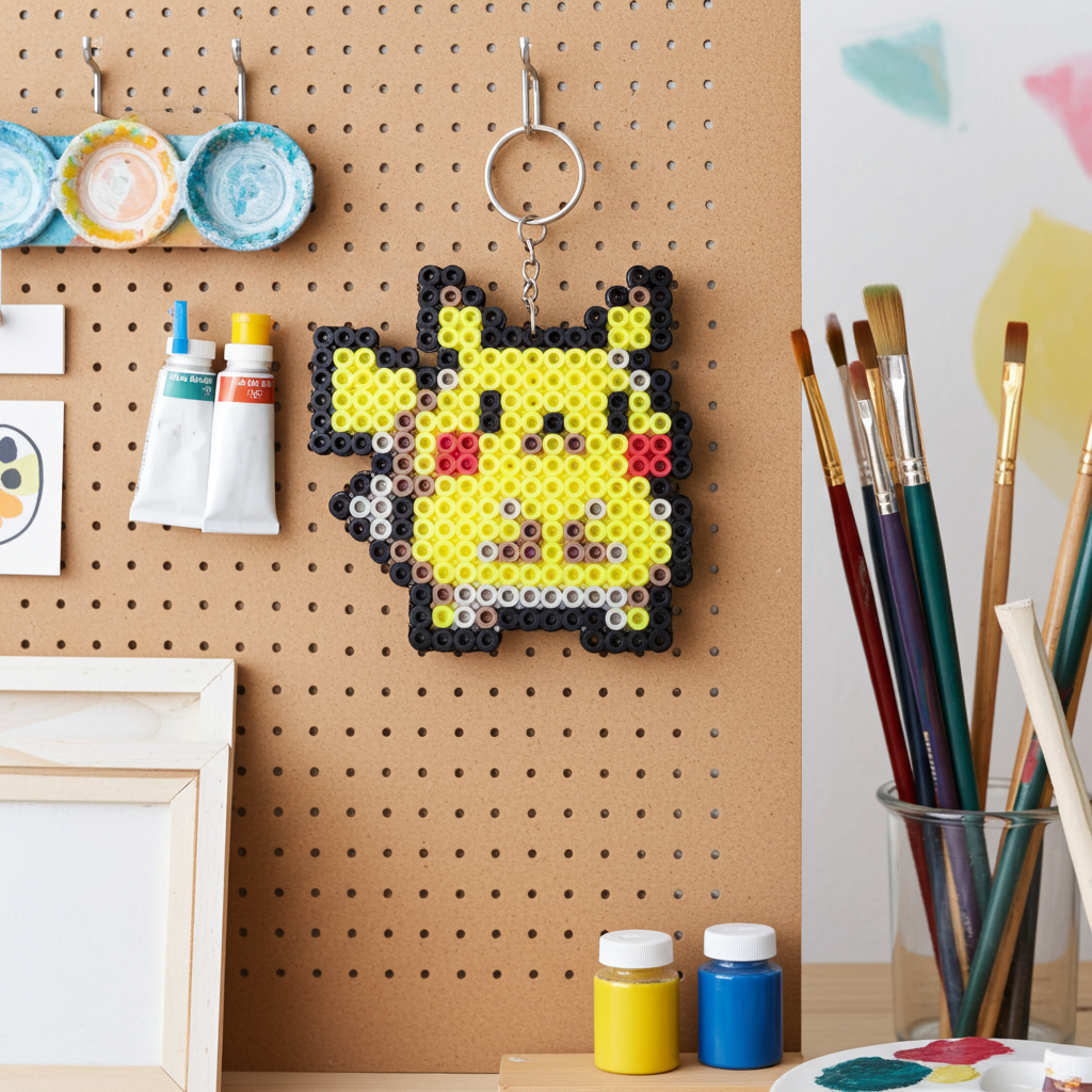 Catch the lightning with this handmade Pikachu Perler bead keychain! Featuring everyone's favorite Electric-type creature in adorable pixelated detail, this charm is perfect for any trainer looking to add a spark of fun to their keys, bag, or gaming gear.