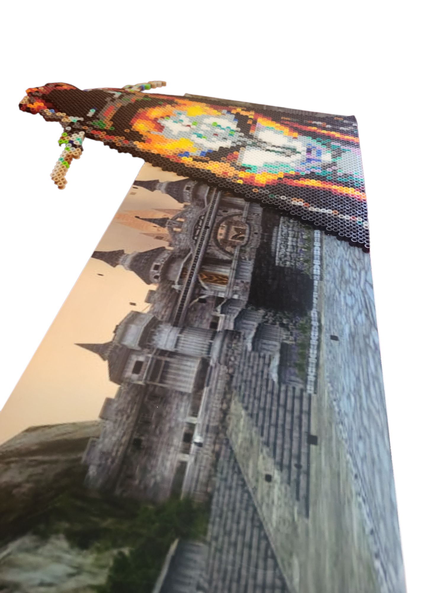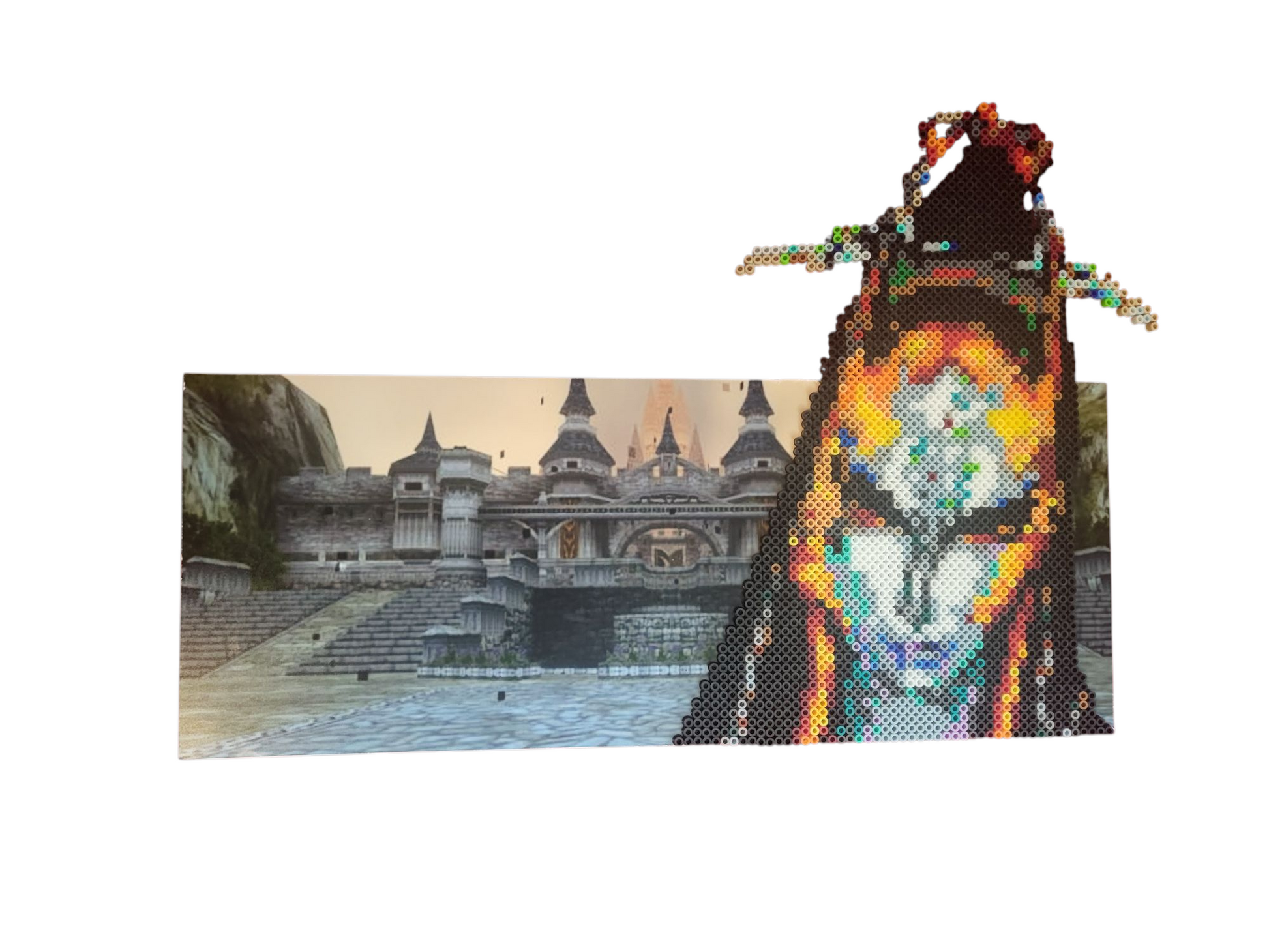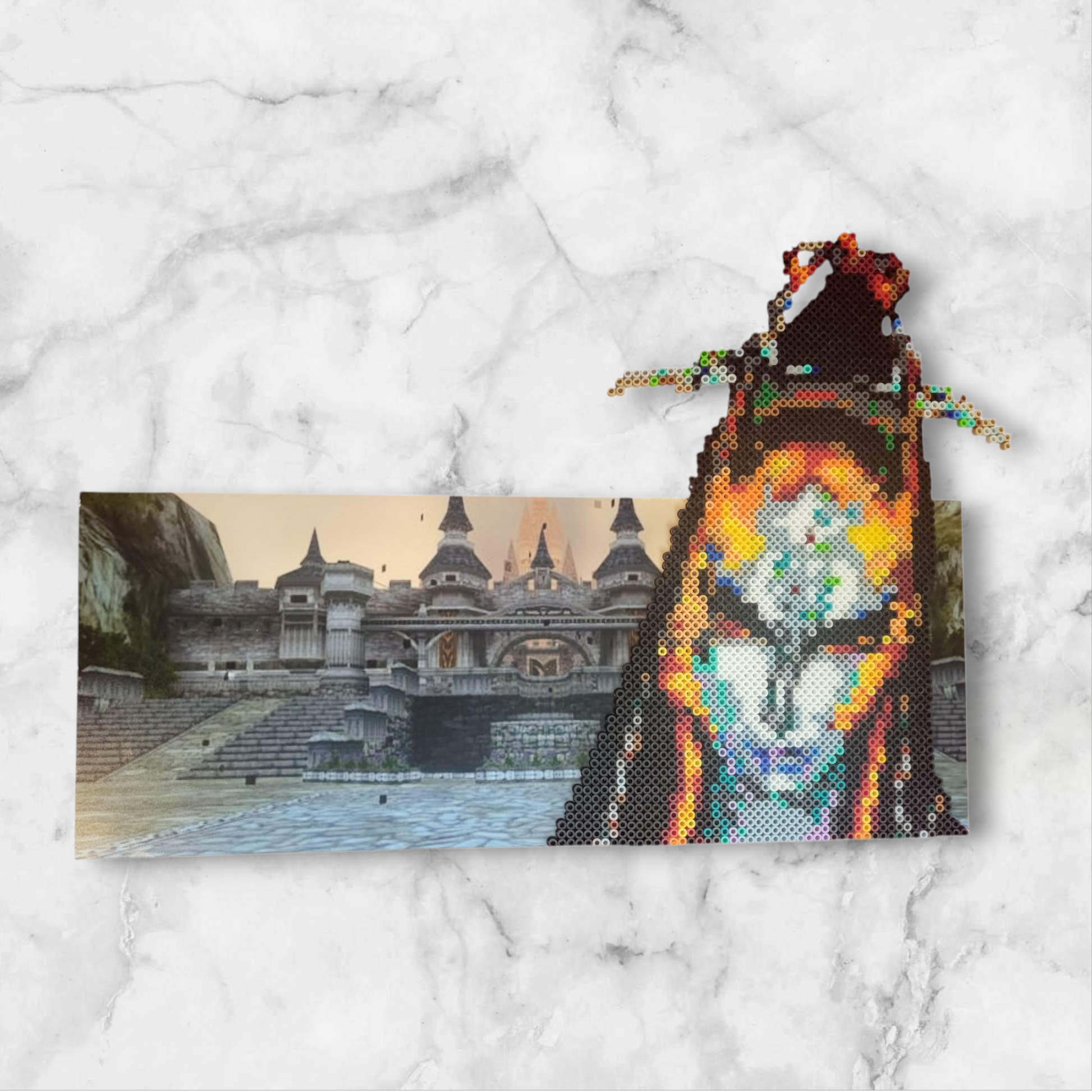 This Perler art features Midna in her true form, set against a backdrop of Hyrule Castle from Twilight Princess. Crafted with clean pixel detail and mounted for display, the piece highlights one of the game’s most visually striking moments. A subtle tribute to a fan-favorite character, perfect for collectors or fans of the darker, more atmospheric side of the Zelda series.