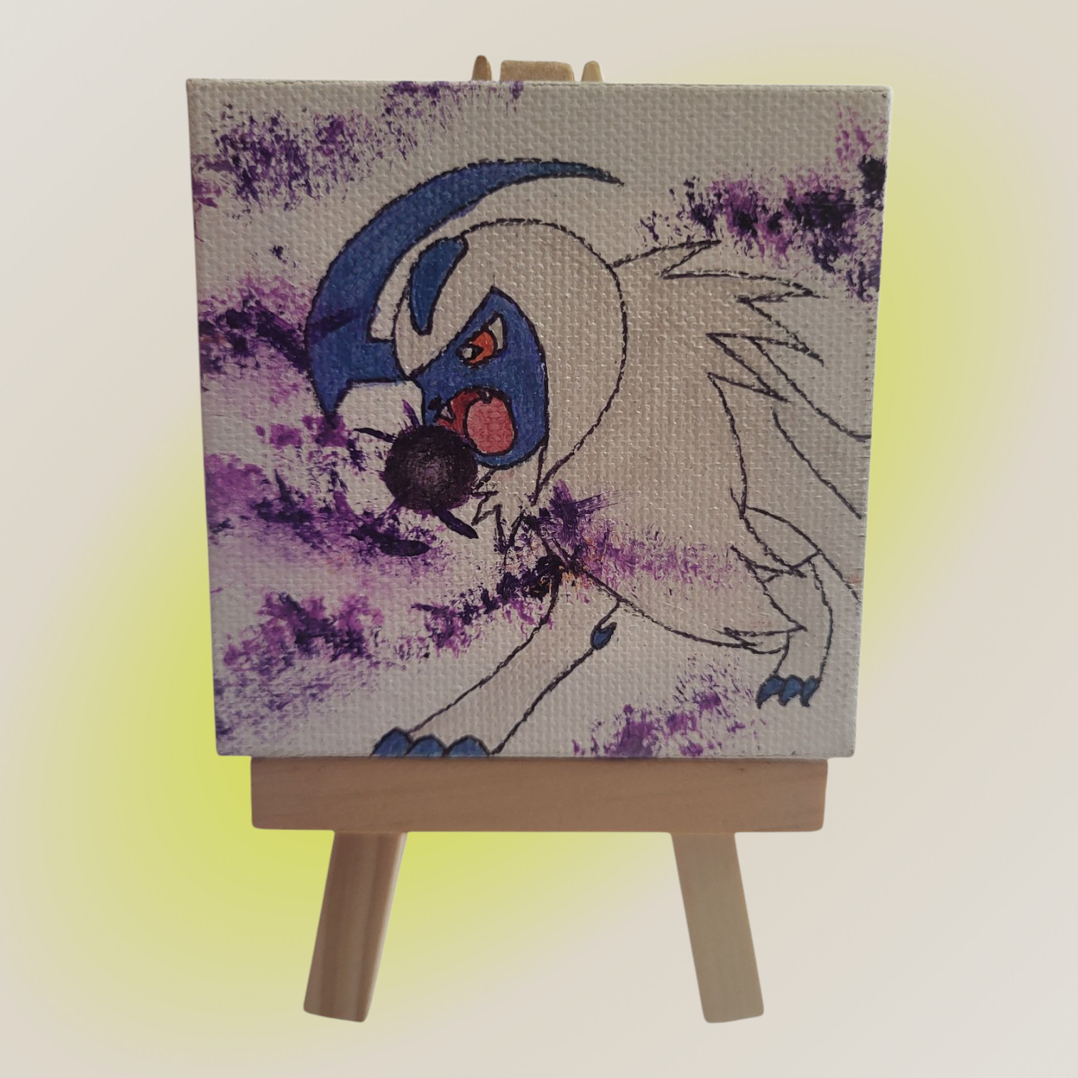 Capture the intensity of Absol in action with this striking drawing of the Disaster Pokémon unleashing a powerful Shadow Ball. Set on a small canvas board mounted on an easel, this piece brings Absol's mysterious and powerful aura to life. Perfectly detailed and full of energy, it’s a must-have for any fan of the Pokémon world who appreciates the elegance and strength of Absol in battle.