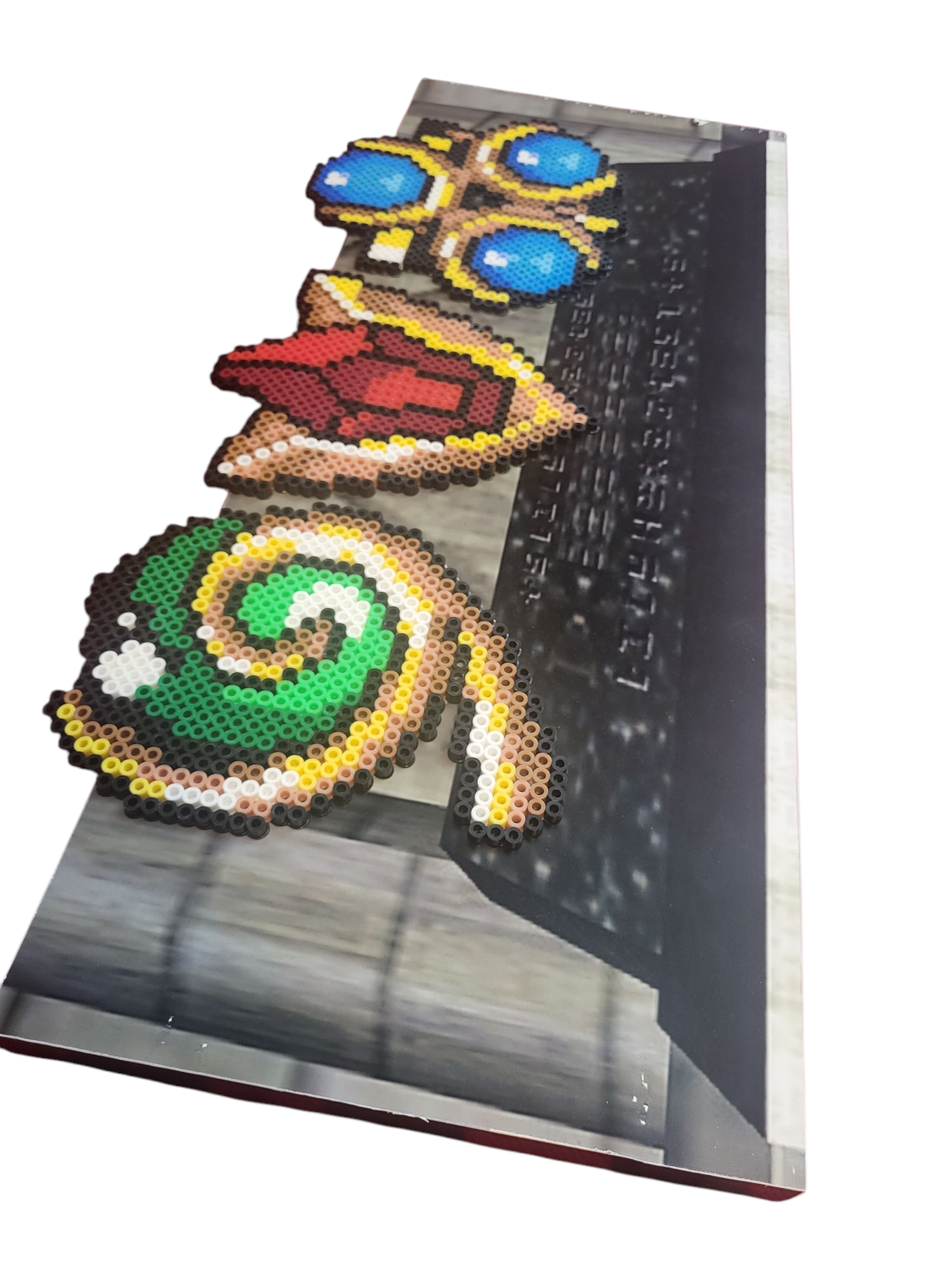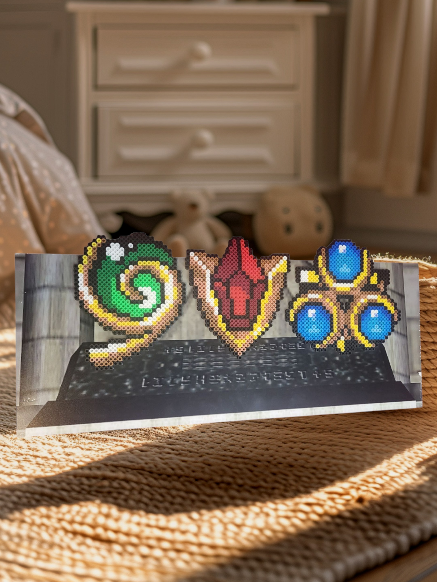 This handcrafted Perler art set features the Kokiri’s Emerald, Goron’s Ruby, and Zora’s Sapphire — each recreated in vibrant pixel detail and mounted for elegant display. Whether you’re a lifelong Zelda fan or just beginning your journey through Hyrule, this piece brings the magic and myth of Ocarina of Time into the real world. Perfect as a centerpiece or a thoughtful gift for the Hero of Time in your life.